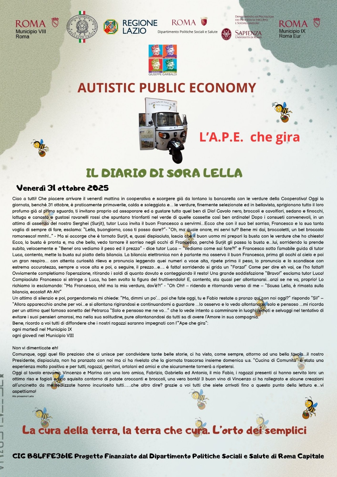 L’A.P.E. (Autistic Public Economy) è il progetto che porta i prodotti dell’orto sociale della Cooperativa Garibaldi direttamente nei quartieri di Roma. Gestita da persone autistiche, questa iniziativa unisce agricoltura, inclusione sociale e autonomia lavorativa, trasformando il lavoro in un vero progetto di vita. Ogni martedì nel Municipio IX e ogni giovedì nel Municipio VIII, l’A.P.E. gira e porta con sé molto più di frutta e verdura: porta dignità, partecipazione e cittadinanza attiva.