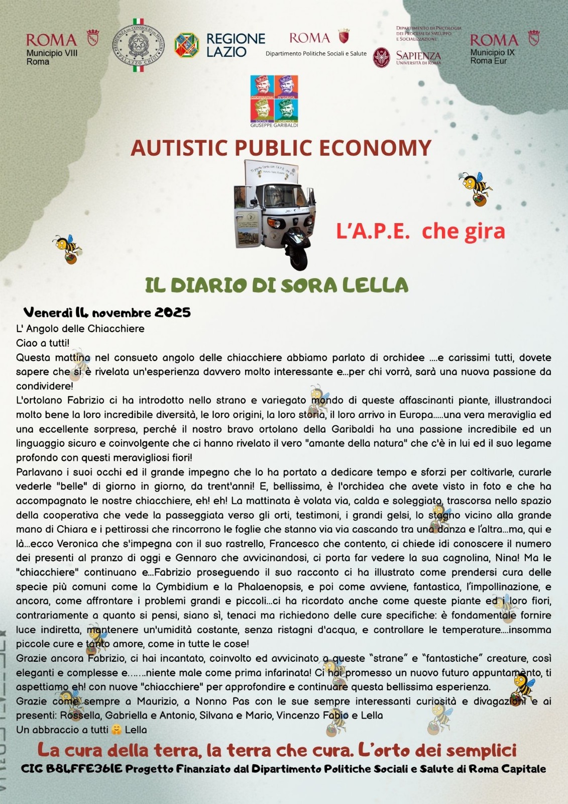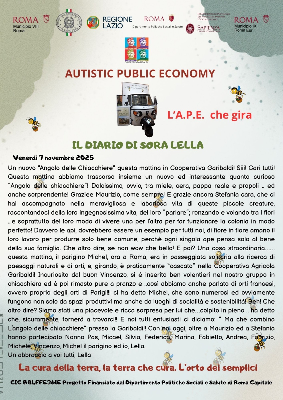 L’A.P.E. (Autistic Public Economy) è il progetto che porta i prodotti dell’orto sociale della Cooperativa Garibaldi direttamente nei quartieri di Roma. Gestita da persone autistiche, questa iniziativa unisce agricoltura, inclusione sociale e autonomia lavorativa, trasformando il lavoro in un vero progetto di vita. Ogni martedì nel Municipio IX e ogni giovedì nel Municipio VIII, l’A.P.E. gira e porta con sé molto più di frutta e verdura: porta dignità, partecipazione e cittadinanza attiva.