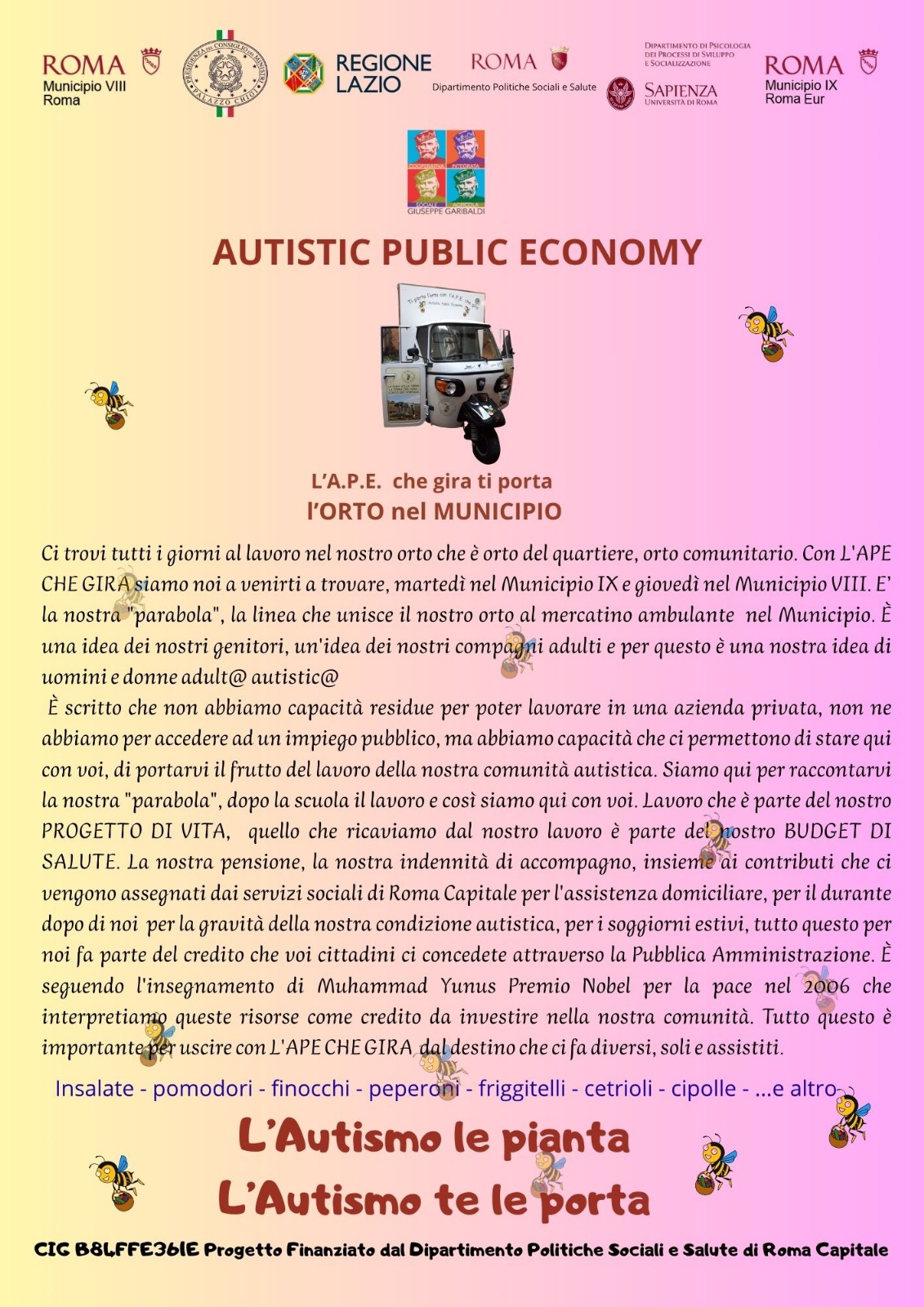 L’A.P.E. (Autistic Public Economy) è il progetto che porta i prodotti dell’orto sociale della Cooperativa Garibaldi direttamente nei quartieri di Roma. Gestita da persone autistiche, questa iniziativa unisce agricoltura, inclusione sociale e autonomia lavorativa, trasformando il lavoro in un vero progetto di vita. Ogni martedì nel Municipio IX e ogni giovedì nel Municipio VIII, l’A.P.E. gira e porta con sé molto più di frutta e verdura: porta dignità, partecipazione e cittadinanza attiva.